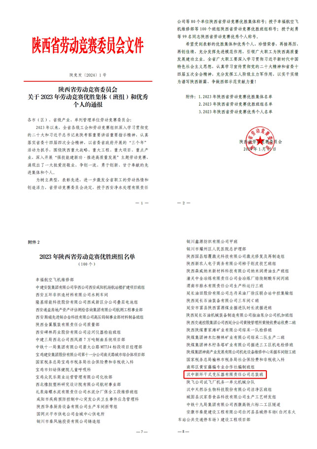 喜讯!新环干变总装班荣获“陕西省2023年劳动竞赛优胜班组”荣誉称号